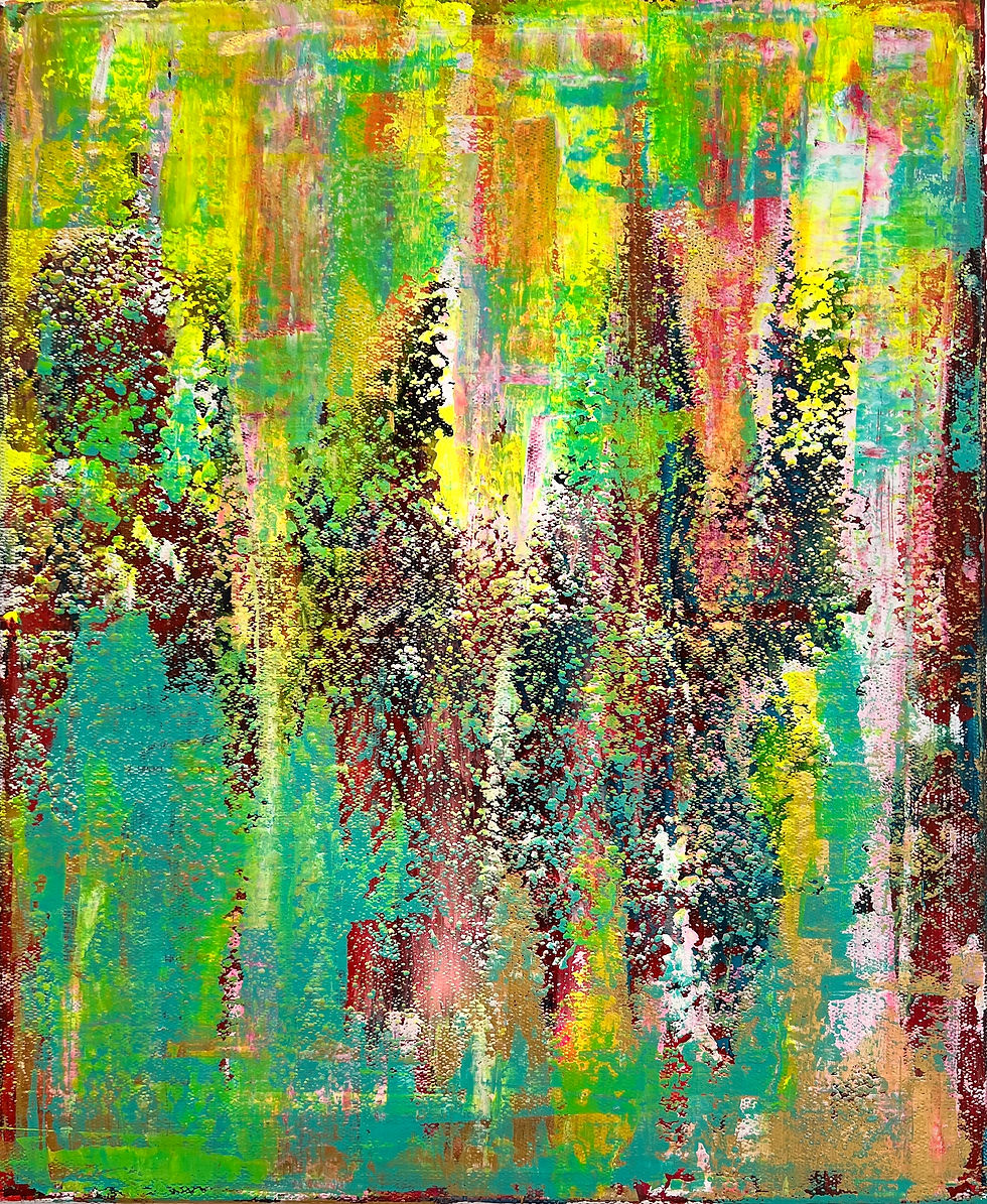 Peintre de l’instinctif, sa peinture, travaillée à la spatule, offre une composition où les passages se chevauchent, laissant apparaître le souvenir du geste et d’une couleur oubliée.